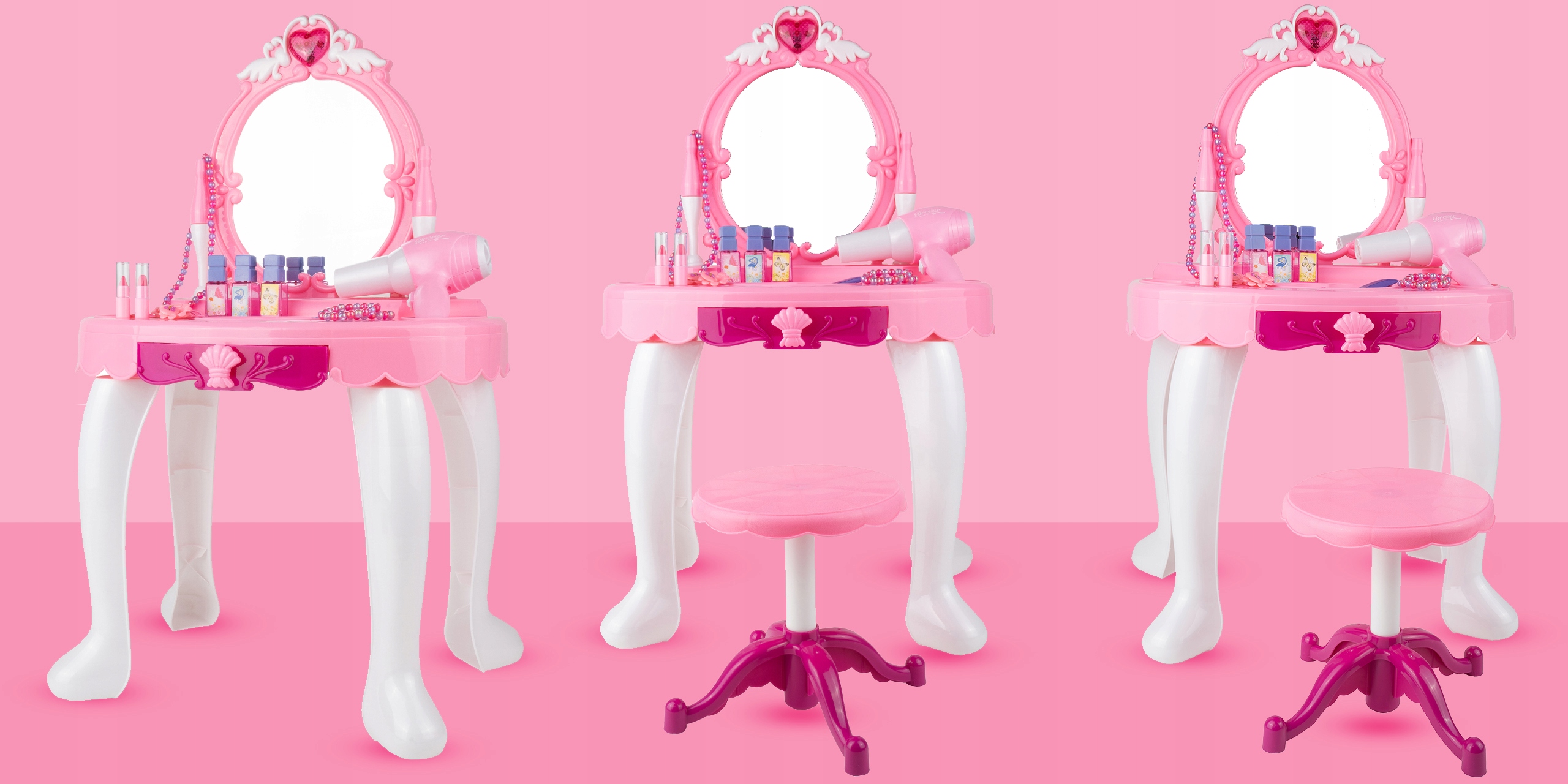 Masa de machiaj este robusta. Setul include si un taburet stabil si rezistent, perfect adaptat pentru copii. Dispune de un sertar pentru depozitarea bibelourilor si a gadgeturilor utile. Masa de toaleta este echipata cu lumini si sunete – inima de pe oglinda se aprinde si reda muzica atunci cand este apasata.
