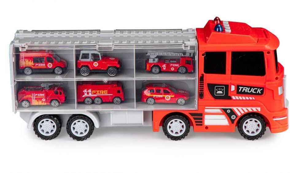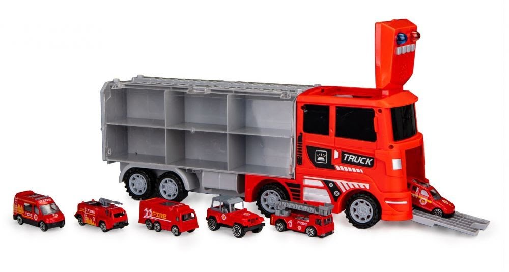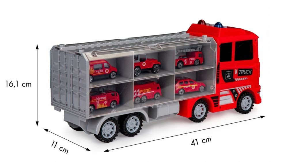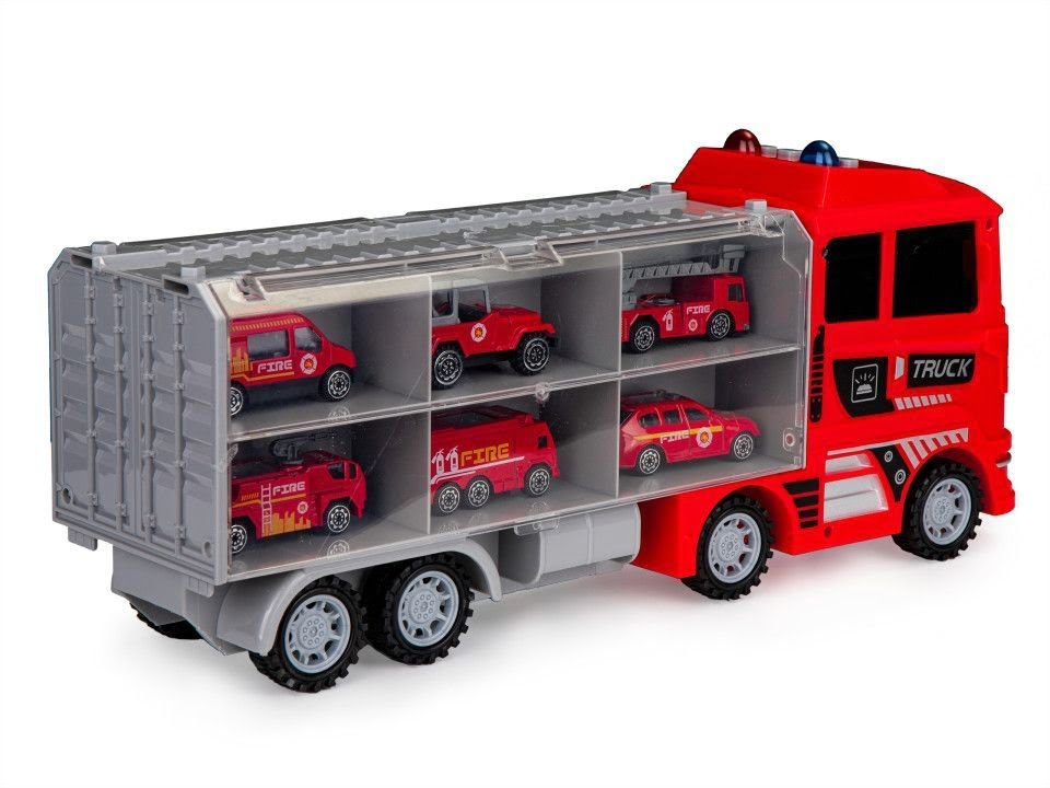 Set Camion cu 6 masinute de pompieri, TIR TRUCK tip transportor, 41 cm lungime.