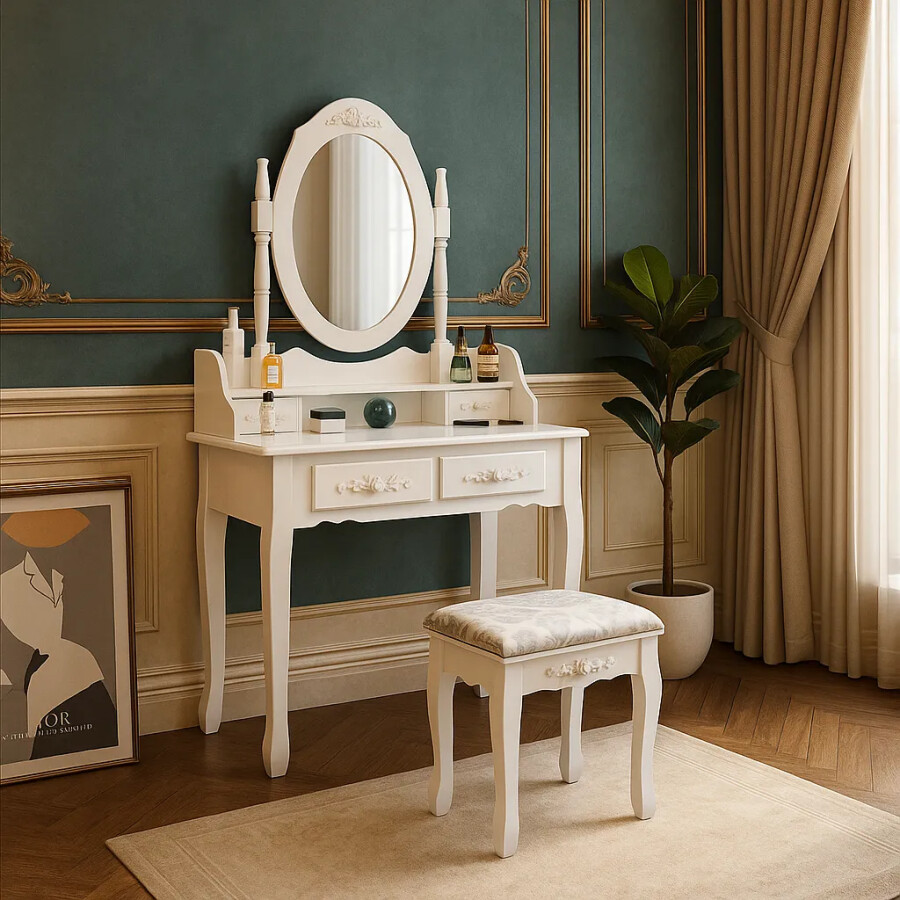 Set Masa Toaleta Mira pentru Machiaj cu Scaun, Oglinda si 4 Sertare, Alba